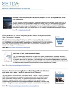 - Research and Best Practices on Technology and Education – SETDA is a key resource for research and best practices on access to and use of technology in education, focused on the experiences of states in supporting innovation in schools and districts. Annually, SETDA works with its members to compile best practice examples, track emerging trends in state educational technology leadership, and disseminate those examples widely to state and federal leaders and the media. We also conduct ad hoc and SEA benchmarking research on topics of interest to the membership and organization, such as eLearning, broadband and digital equity. Examples of SETDA’s work include: